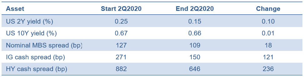 Exhibit 2: Low and stable rates, tightening spreads in 2Q2020