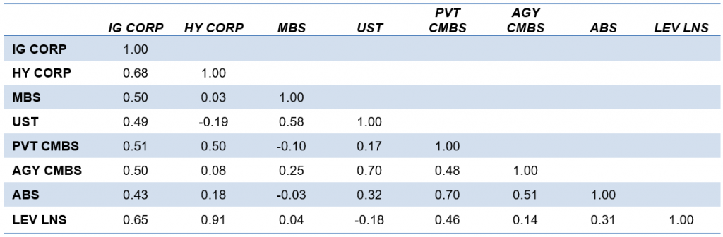 The other aspect of performance worth noting is the correlation of returns, where differences in rate and spread exposure create some diversification. The most notable, which is consistent with earlier periods, is the slight negative correlation between performance on credit and rates. That is highlighted by the negative correlation between high yield and loans and Treasury debt (Exhibit 4). Rates and credit diversify one another.