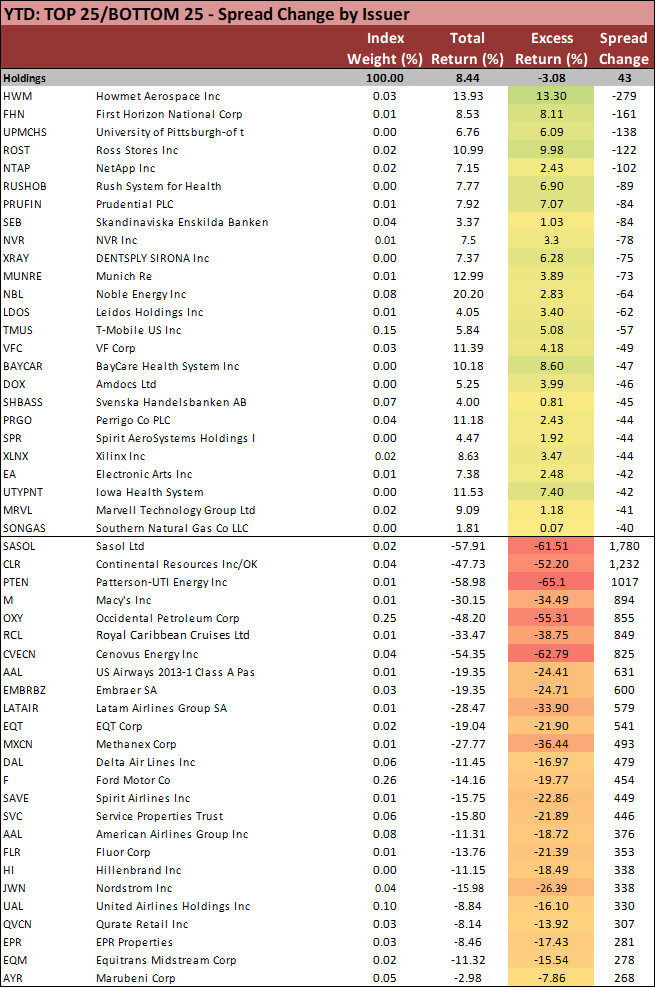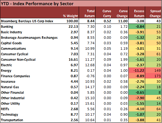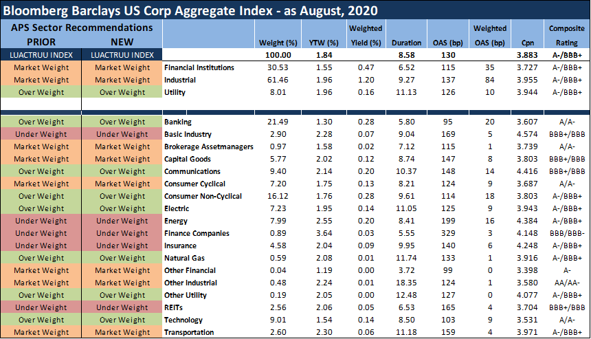 Note: The table summarizes how APS expects sectors within the IG Index to perform for the next several months, on an Excess Return basis (total return net of commensurate UST return). These weightings serve as a proxy for how portfolio managers should position their holdings relative to the broad IG corporate bond market. Source: Bloomberg/Barclays US Corporate Index, Amherst Pierpont Securities