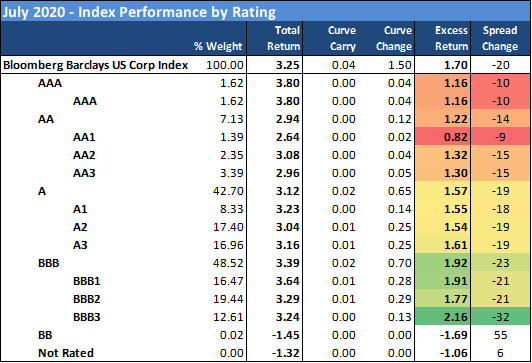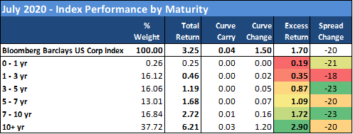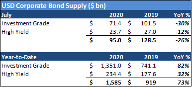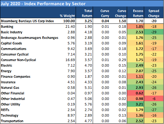 For another consecutive month, investment grade corporate bond investors targeted more risk and favored higher beta credits, but appeared to be bit more selective about which sectors they took on more credit and duration risk than in previous months. The IG Index tightened -20 bp in aggregate to +130 bp at month-end, trimming the year-to-date spread sell-off to a +43 bp move since the start of the year. July excess return was +1.70% with a total return of +3.25%, and 2020 returns stand at -3.08% and +8.44%, respectively.