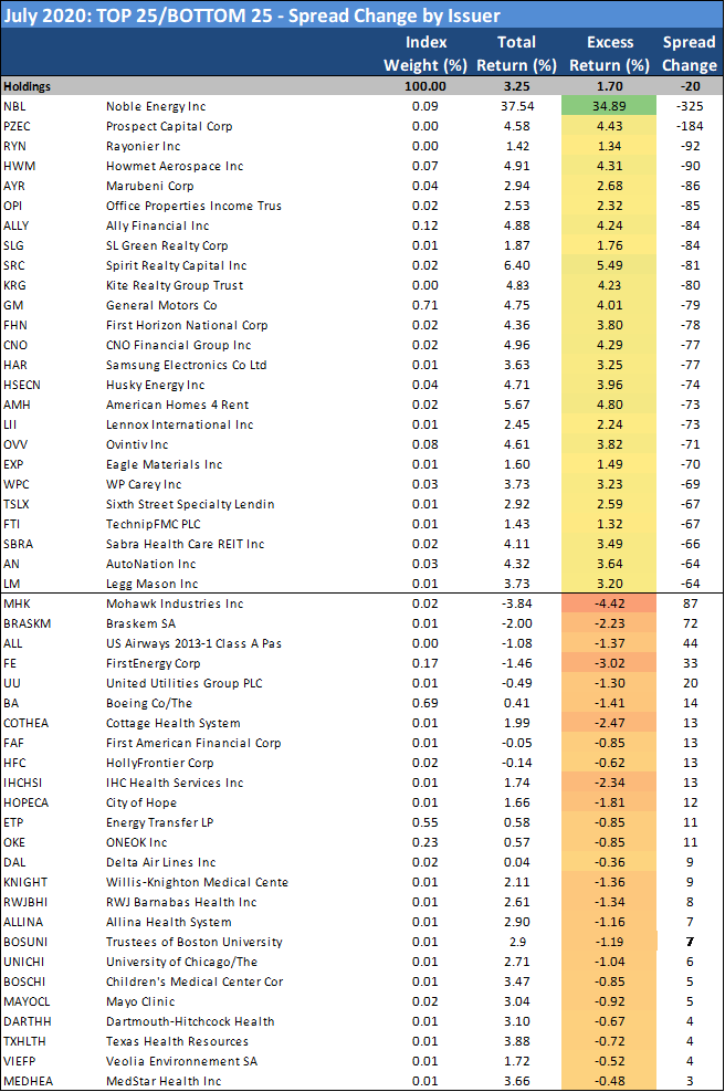 After leading the Index for two consecutive months, Energy (+2.07% excess return) fell out of the Top 5, as the recovery in oil prices stalled out in July, leading to more mid-tier performance in credit. Utilities were a favored strategy for July, with Electric (+2.49%) and Natural Gas (+2.93%) among the leading performers in the Index. Rounding out the top 5 were Basic Industry (+2.53%)—led by chemicals and precious metals credits—as well as Transportation (+2.52%) and Insurance (+2.43%), with investors seeking out long duration plays in credit. The 30-year US Treasury rallied to +1.20% at month end from over 1.40% at the prior month close. On the other side of the coin, Banking (1.05%) registered the single weakest return in July as the Treasury curve collapsed and projected interest margins compressed. Also falling out of favor from the prior month were Finance Companies (+1.11%) as the GE recovery story stalled on weak earnings and outlook in their 2Q20 results. Other bottom performers included Technology (+1.36%), Capital Goods (+1.61%)—due in large part to incredibly weak performance and disappointing outlook at Boeing—and Communications (+1.61%).