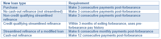 A few loan types require more than three consecutive payments following forbearance. Modified loans must make six payments on their modified loan, and cash-out refinances require 12 consecutive payments post-forbearance.