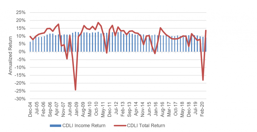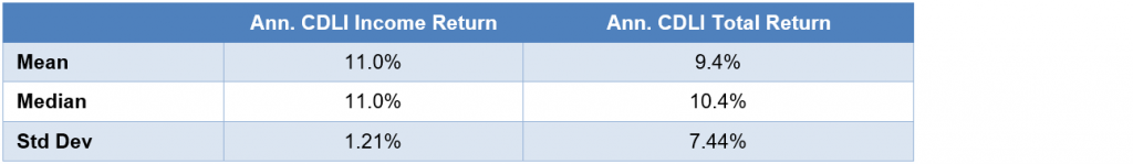 For investors trying to get their arms around the potential portfolio role of private debt, the market offers little by way of return track records. But Cliffwater, LLC, has built a Direct Lending Index that tracks the publicly reported gross, unlevered returns on private mid-market corporate loans held by business development companies. That index shows a history of returns dominated by high and steady annual income, averaging 11% since 2004 with a standard deviation of 1.21% (Exhibit 2). Total returns are lower and much more volatile, averaging 9.4% since 2004 with a standard deviation of 7.44%. As a benchmark, the Bloomberg Barclays High Yield Index has delivered a compounded annual total return over the same period of 6.69% while the S&P/LSTA Leveraged Loan Index has delivered 4.28%. The Cliffwater index returns likely reflect the premium for lending to smaller, more leveraged companies as well as the premium for giving up substantial liquidity in private debt.
