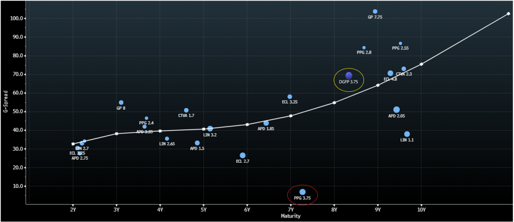 With just under half of EBITDA generated from its autoroutes segment and roughly 17% from its airports unit, the vaccine should prove beneficial in bringing EBITDA margins closer to pre-pandemic levels much faster than previously estimated. S&P was not calling for an international air traffic recovery until 2024 prior to vaccine announcements. Clearly air travel was the hardest hit, but toll road traffic was down nearly 33% in the first half of 2020 at DGFP. Road traffic trends have improved and are likely to make bigger gains in 2021 as employees go back to work and those who cannot afford air travel turn to the roads for vacations. While DGFP is typically compared to European peers, its USD 2029 bonds trade relative to US basic industry peers (Exhibit 1). The DGFP 3.75% 2029 bonds look attractive relative to the single-A basic industry curve and actually traded through PPG 3.75% 2028 bonds by roughly 7 bp (g-spread) in mid-January of this year.