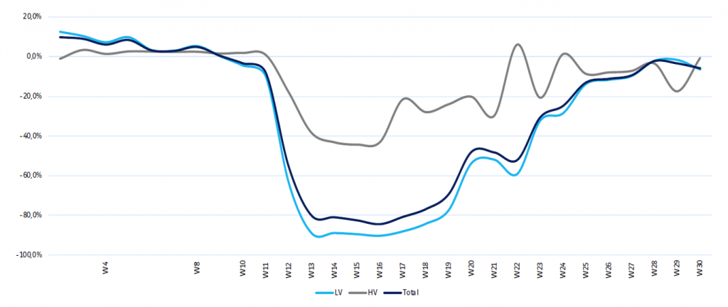 Toll roads saw traffic decline 32.8% in the first half of 2020, despite witnessing a 9% increase in the first two months of the year. France’s 100km restraints imposed during lockdown forced light vehicle (LV) traffic to plummet 87% while heavy vehicle (HV) traffic fell 36%. Revenues at the autoroutes unit witnessed a 27% decline year-over-year (to EUR 1.9 billion) during the first half of 2020, while EBITDA fell 34% (to EUR 1.3 billion). The autoroutes unit enjoys very high EBITDA margins, typically in the mid 70% range. Despite the sharp decline in revenues and EBITDA, the margin only fell 690 bp year-over-year (to 69.9%). Trends did improve in May following the partial easing of travel restrictions and further improved in June when restrictions were lifted altogether. As of the company’s earnings call at the end of July, traffic levels had resumed and management noted that they are close to 2019 levels (Exhibit 2).