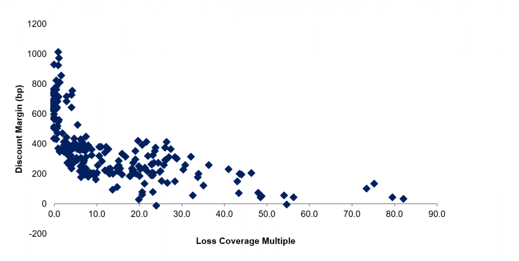Unsurprisingly, when mapping loss multiples against OAS, bonds with higher loss coverage multiples generally trade to tighter spreads while those with lower multiples to wider ones. (Exhibit 1)