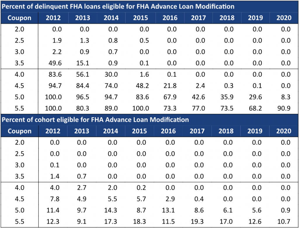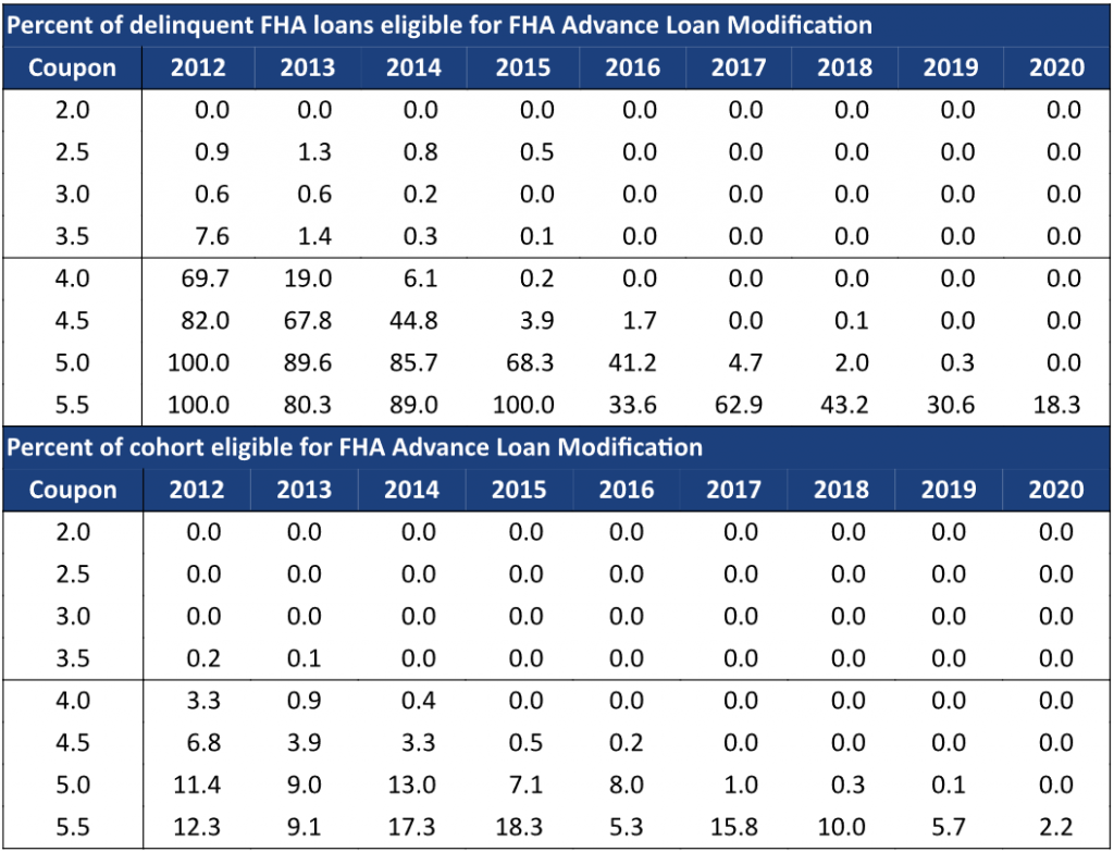 Most of the delinquent FHA loans that currently look eligible for ALM are in high coupons or seasoned pools (Exhibit 1). The top half of the table shows the percent of delinquent FHA loans that would qualify for an ALM assuming a 3% mortgage rate and assuming borrowers use the maximum allowable forbearance. Most delinquent FHA loans in 4% and higher coupon pools originated in 2012 would qualify for ALM, for example. But loans originated after 2016 need to be in a 5.5% coupon pool to achieve a 25% P&I reduction.