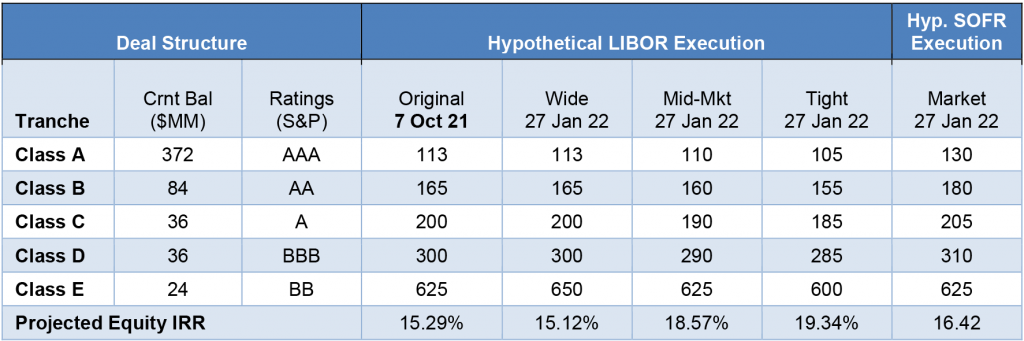 For investors that assume hypothetical new LIBOR deals would price either at levels from late 2021 or at the wide end of the current estimated LIBOR range, current SOFR levels deliver a higher IRR to equity and look equity friendly. For investors that assume hypothetical new LIBOR deals would come at tighter levels than late 2021, then current SOFR deals deliver a lower equity IRR and look debt friendly.