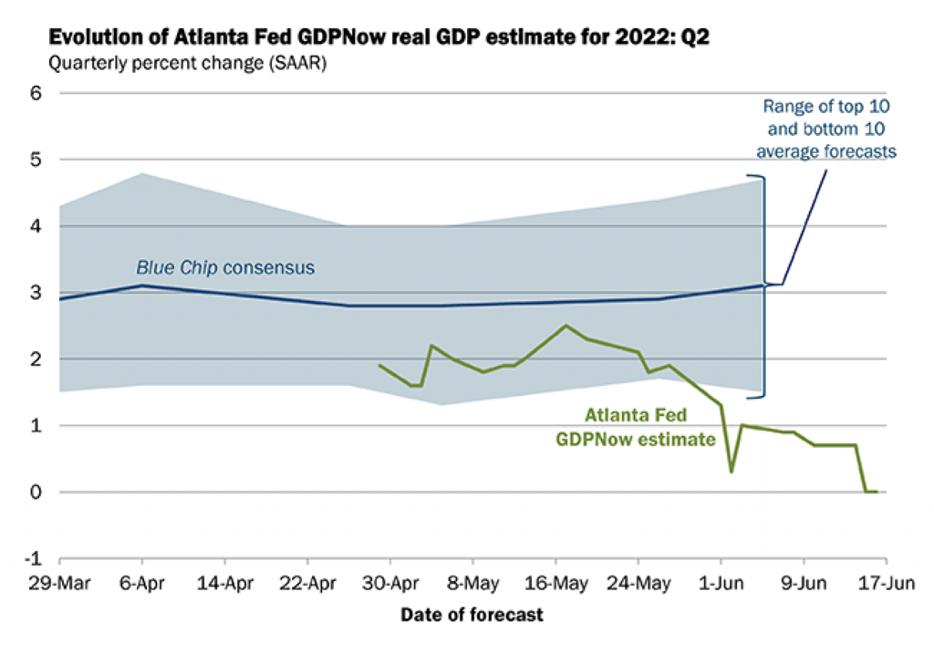 That brings us to the current quarter.  As the Fed has accelerated the pace of rate hikes and financial conditions have tightened considerably, there have been a few signs of cooling.  In particular, the housing sector appears to be coming off the boil.  It is understandable that financial market participants, looking at the S&P 500 drop almost 25% from its January highs and interest rates rise faster than they have in decades, are worried.  Similarly, consumer sentiment has plunged, as households have grown grumpy in the face of 40-year highs in inflation.  Still, fears of an immediate economic downturn have been exacerbated by an outlier reading from a widely followed GDP tracker.