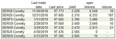 The development of a SOFR term structure and derivatives market is paramount, if SOFR swaps are ever going to credibly supplant LIBOR swaps and Eurodollar futures. Three-month and one-month SOFR futures began trading on the Chicago Mercantile Exchange in May 7, 2018. Six months into trading, SOFR futures volume is somewhat anemic (Exhibit 3 and 4):