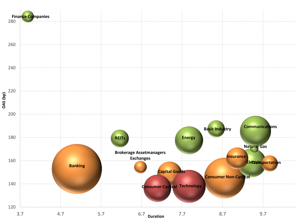We are not making any changes to our sector relative value views this month. The graphic below provides a summary of how APS expects sectors within the IG Index to perform for the next several months on an excess return basis (total return net of commensurate UST return). These suggestions serve as a proxy for how we recommend that portfolio managers should position their holdings relative to the broad IG corporate bond market. The relative value recommendations consider a six-month time horizon.
