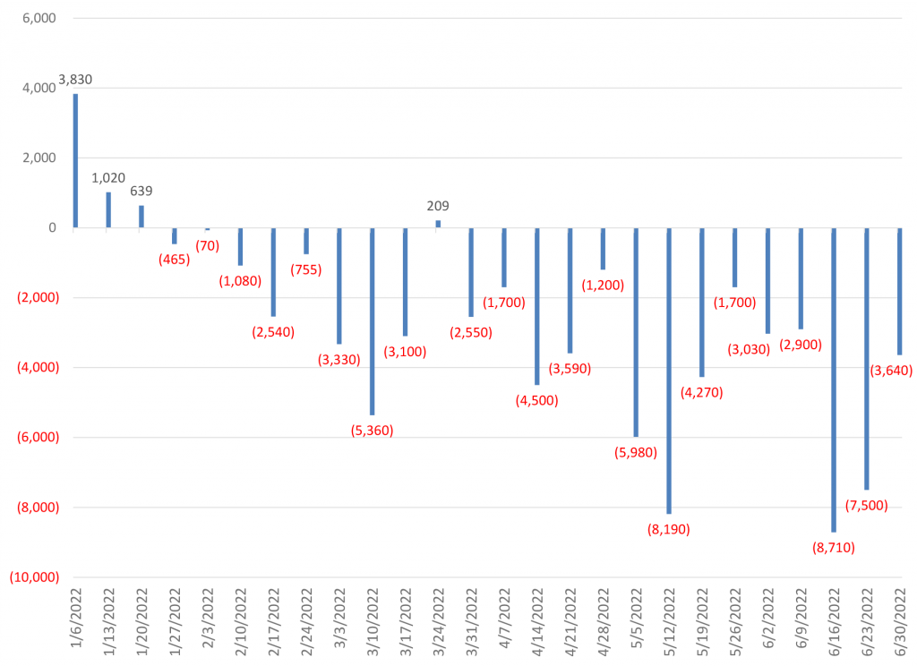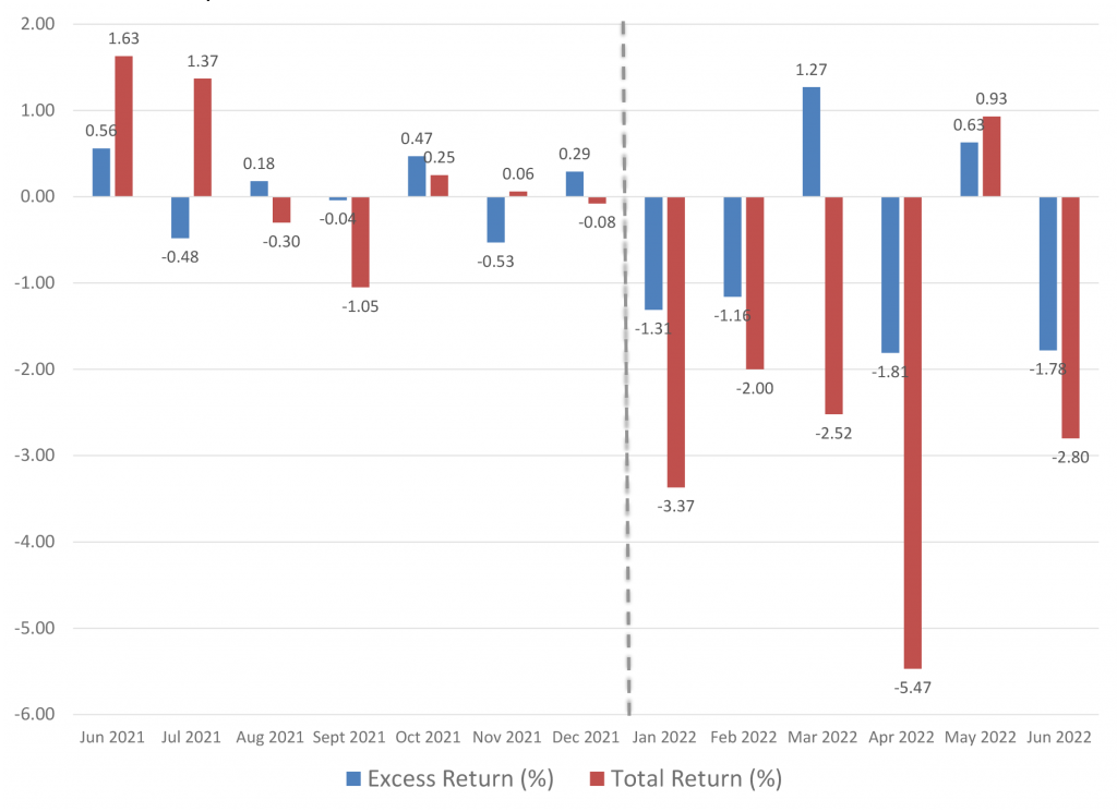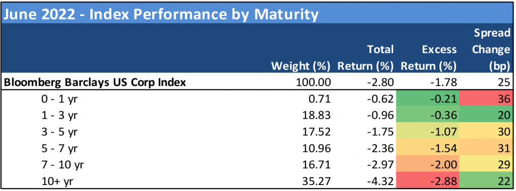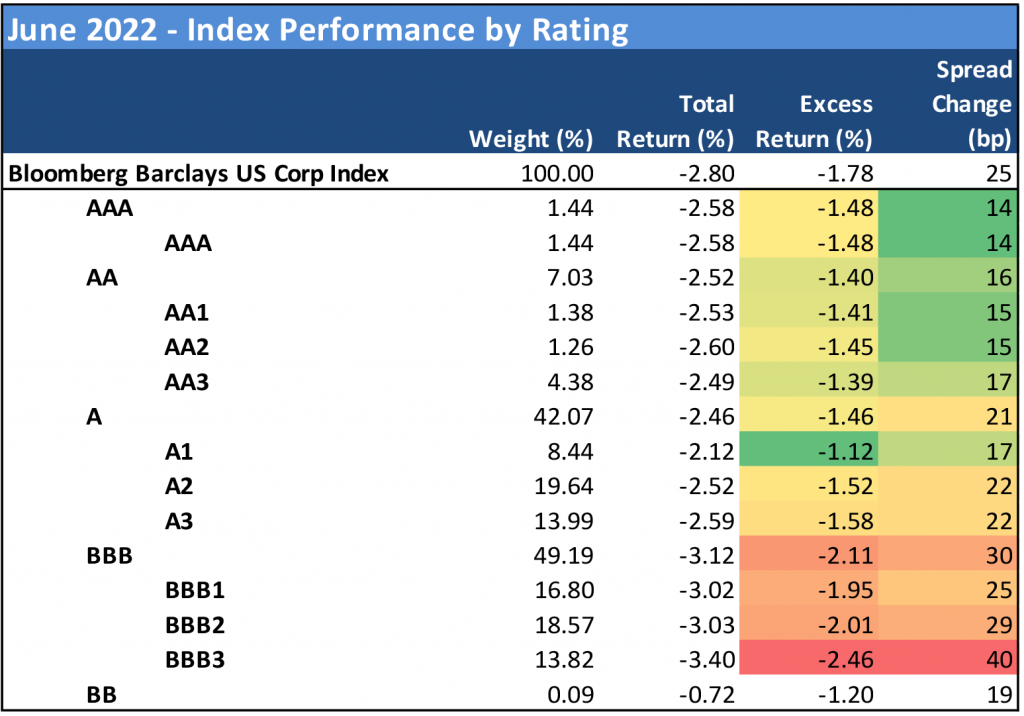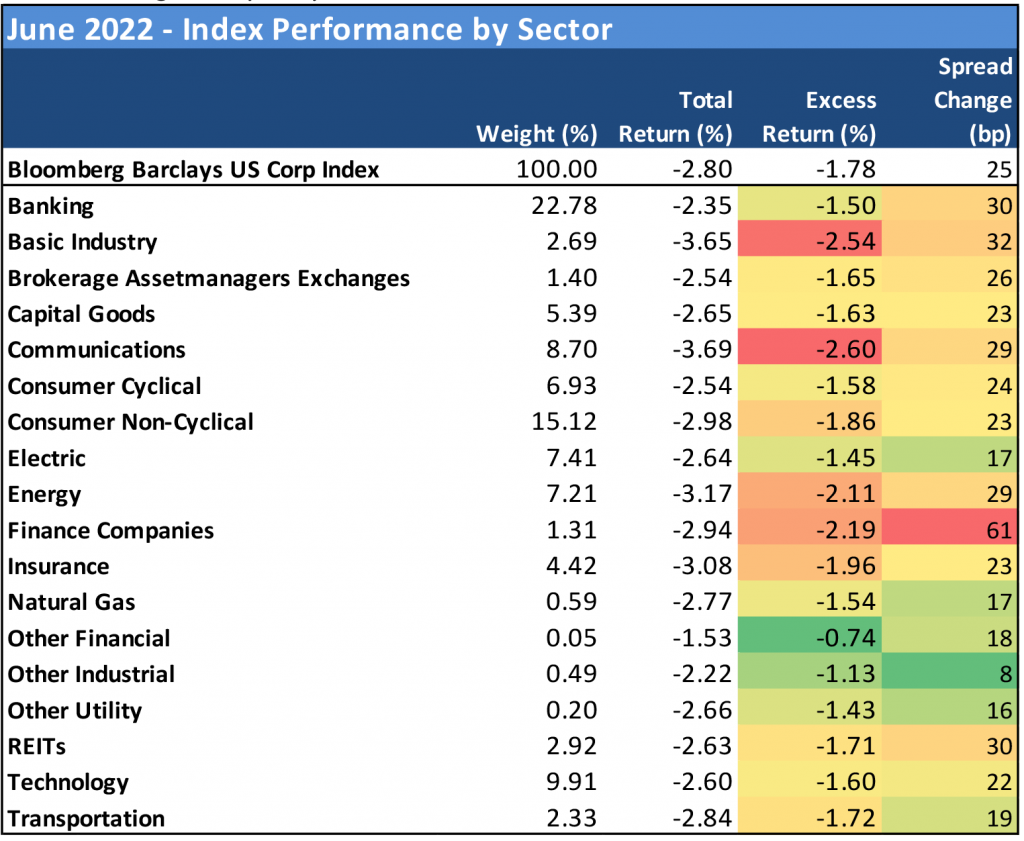 After modest gains in May, the investment grade corporate bond index headed south again in June, producing the third worst month of excess returns so far this year at -1.78%. Aggregate OAS widened 25 bp and total return for corporate bonds was -2.80% for the month as rates continued to rise. US investment grade bond funds saw nearly $26 billion in outflows in June. Higher beta credit took the hardest hit, and few parts of the Index escaped the punishment to risk assets throughout the month.