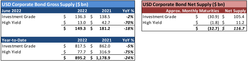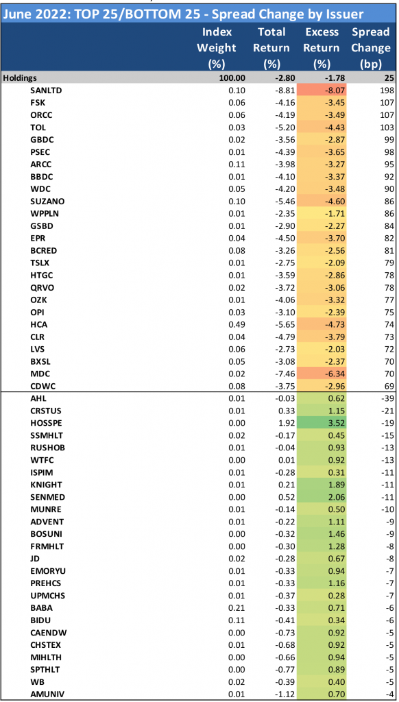 The anatomy of this month’s sell-off was not particularly surprising given the broad markets’ collective aversion to risk assets. Higher beta credit suffered the worst of the losses with low-BBB corporate bonds registering a massive -2.46% excess return for the month on 40 bp of aggregate spread widening. Communications (-2.60% excess return) produced the single worst performance by sector, followed by basic industry (-2.54%), finance companies (-2.19%)—which saw a staggering +61 bp in OAS widening for June—energy (-2.11%) and insurance (-1.96%). There were not many places to hide by sector, but those areas that saw greater resistance to the broad sell-off included: utilities (-1.45%), banking (-1.50%), consumer cyclical (-1.58%), technology (-1.60%), and surprisingly REITs (-1.71%). Within the finance companies segment, business development companies (BDCs) continue to serve as among the most sensitive areas of credit; while on the other end of the spectrum, universities and medical centers are among the defensive credits, albeit in limited volume.