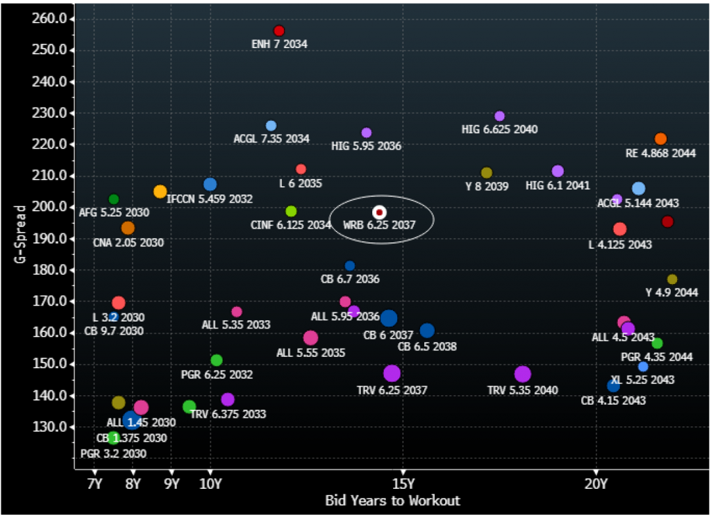 Property and casualty insurance company WR Berkley’s (WRB: Baa1/BBB+/BBB+) 2037 notes are offered at attractive levels relative to the rest of the 10-to-20-year segment, for investors that can hold non-index issues. The company has one of the more stable operating profiles in the peer group, due in large part to its diversified operations and commercial lines. The non-index eligible notes also have the highest coupon in WRB’s capital structure, and could be a tender offer target with attractive take-out terms. Management has not tendered for the issue before, but could be compelled to do so when new issue market conditions become more functional. The company has been an opportunistic issuer in the long-end of the curve over the past two years.