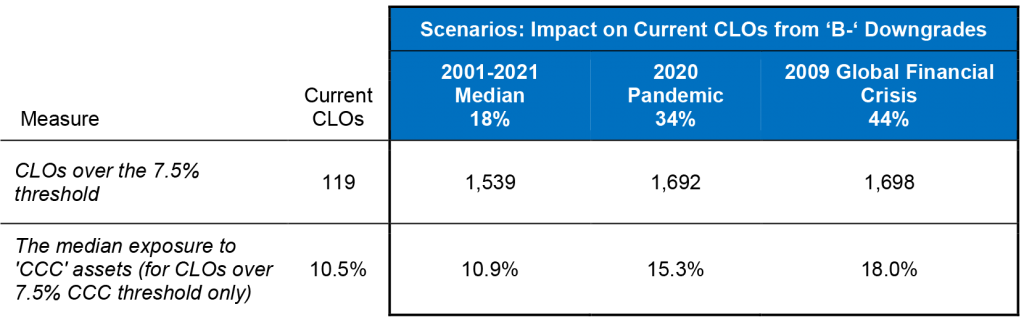 Downgrades in ‘B-“ loans in past recessions have far exceeded 11.6%. According to an S&P rating transition study, the percentage of downgrades in a static pool of ‘B-‘ issuers during 2009 was 44%, and in 2020, 34%. The median 1-year downgrade rate in ‘B-‘ loans from 2001 to 2021 was 18%. Applying those historical rating transitions to current ‘B-‘ loan exposure in CLOs, the vast majority of CLOs will see a jump in ‘CCC’ credits and exceed the maximum allowed 7.5% exposure next year. At the 18% median 1-year downgrade rate for ‘B-‘ loans, median exposure for CLOs over their ‘CCC’ limit should approach the levels of May 2020 (Exhibit 2). And a rate of downgrade similar to earlier recession would exceed May 2020.